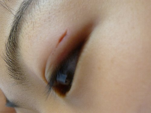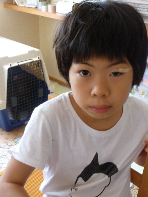 で、凜パパがのぞきに行くと、そこには左のまぶたの上を7mmか8mmほど裂傷してドロンとした血が流れ出てるのを鏡で見つめる姉ちゃんが(--;)