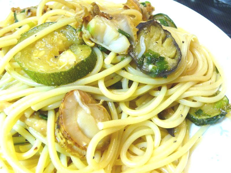 ズッキーニと茄子と葱とホタテのニンニクしょうゆぅ~(^(00)^)v