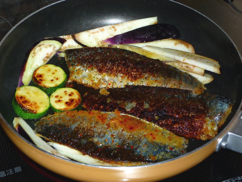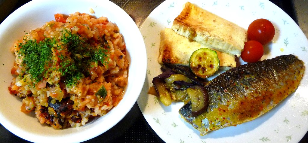 おかずは鯖を焼いたのと茄子とズッキーニと豆腐にプチトマトをそえて。
