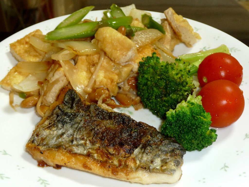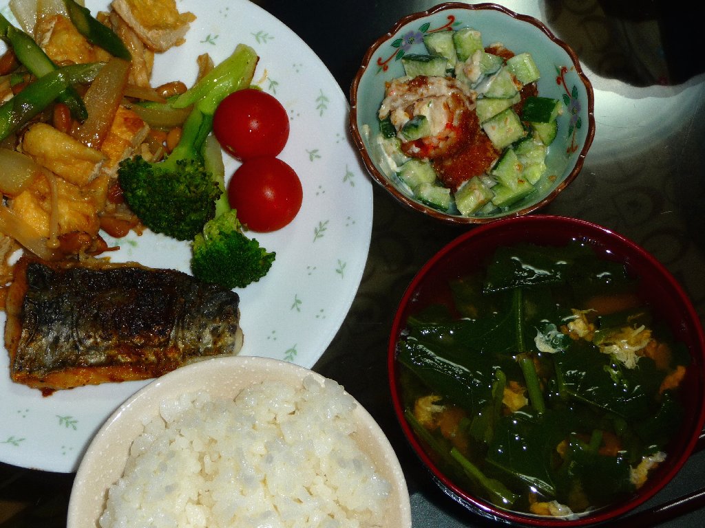 今晩は地サゴシのソテーと油揚げ・えのき・玉葱・アスパラ・納豆の炒め物、プチトマトとブロッコリーを添えて、カルシュームいっぱいの宮内菜のかき玉汁、それからエビフライときゅうりのディップ合え(^(00)^)