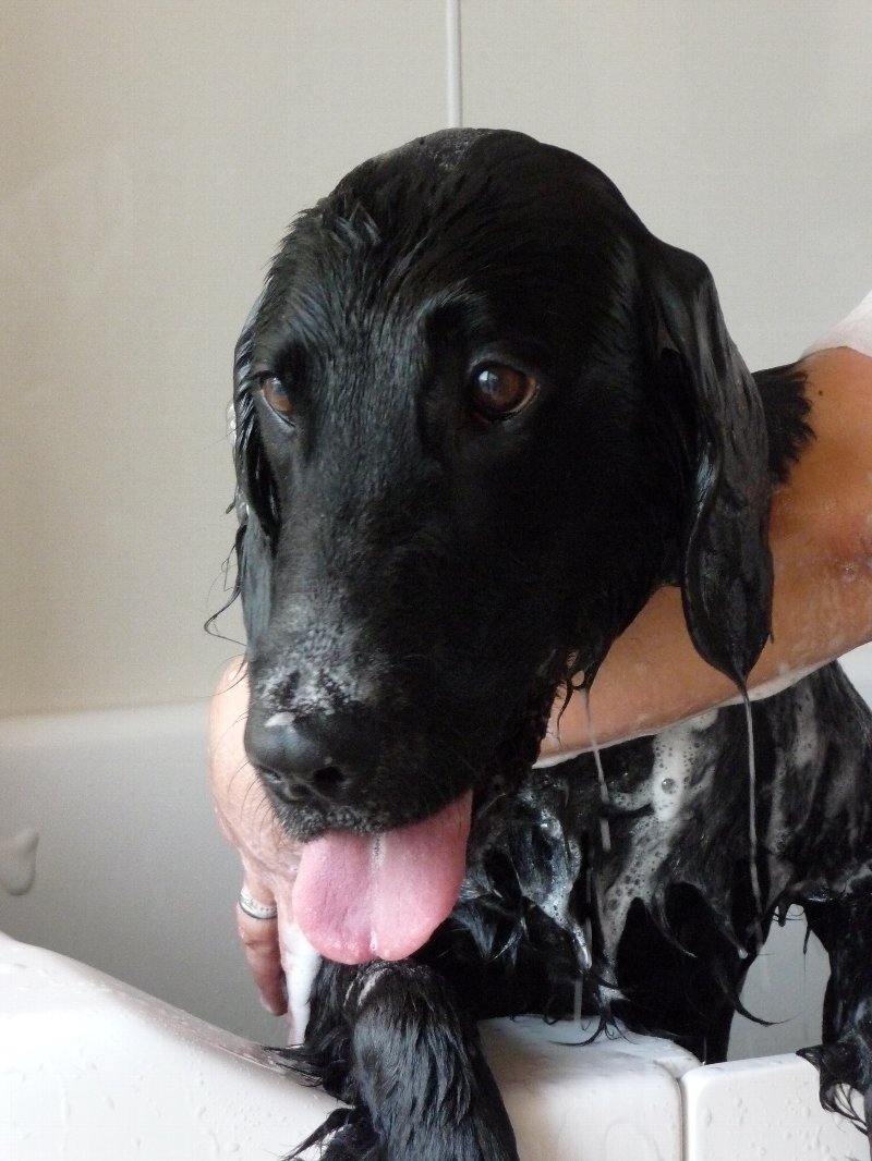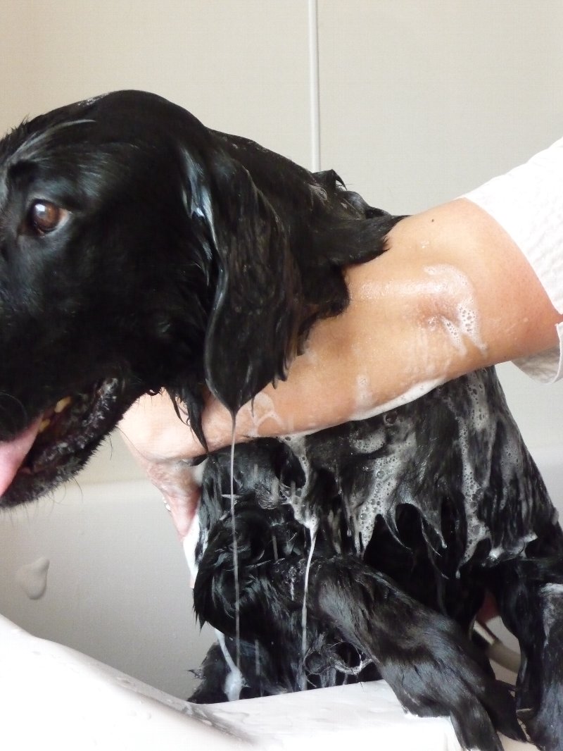 明日定期健診日で狂犬病の注射もするんでしばらくお風呂は入れないしね。