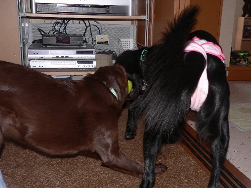 コレは相手してやってんじゃなくってコングの中におやつ入れても出せないカヤのために、この間凜のサニタリーパンツと一緒にガジーを購入(1代目は凜速攻で壊したし)したのに昨日お仕事行ってる間にいれたおやつが出せないで残ってたらしく(カヤやっぱり頭悪いか?!)カヤの寝床に転がってたのを凜が強奪、で、わけもわからずカヤは姉ちゃんの持ってるものは全部欲しいでごじゃりましゅるぅ~!って(^。^;)