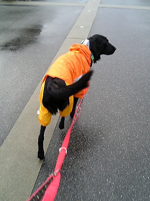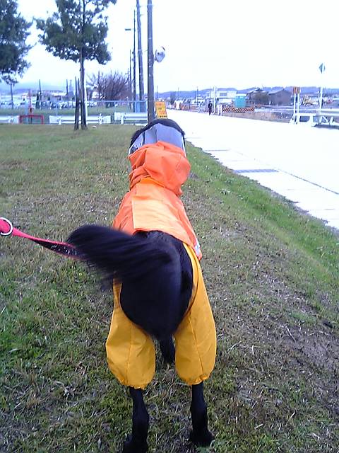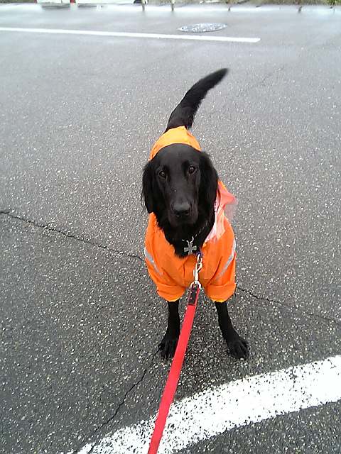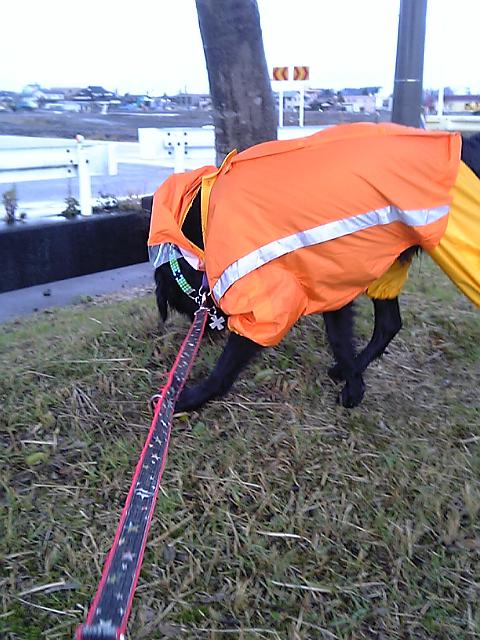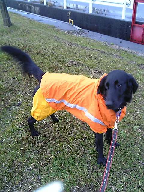 姉ちゃんが帰ってくる頃えらい強い雨が降り出したんで、凛輔にレインコートを着せて様子見に散歩にでました。