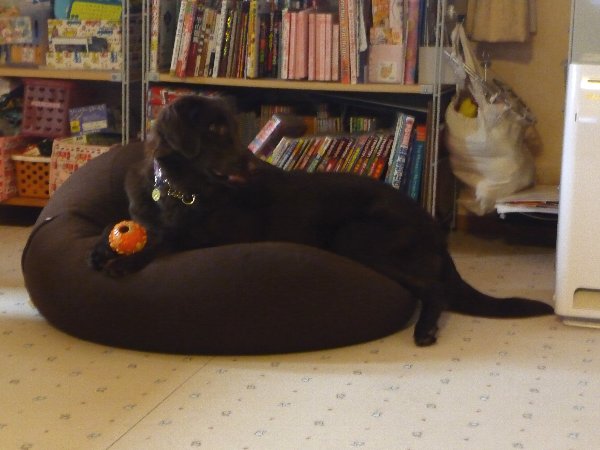 ソファー好きのこやつ、凜パパのクッション我が者顔!まぁ凜パパカヤには甘いからいいのか?