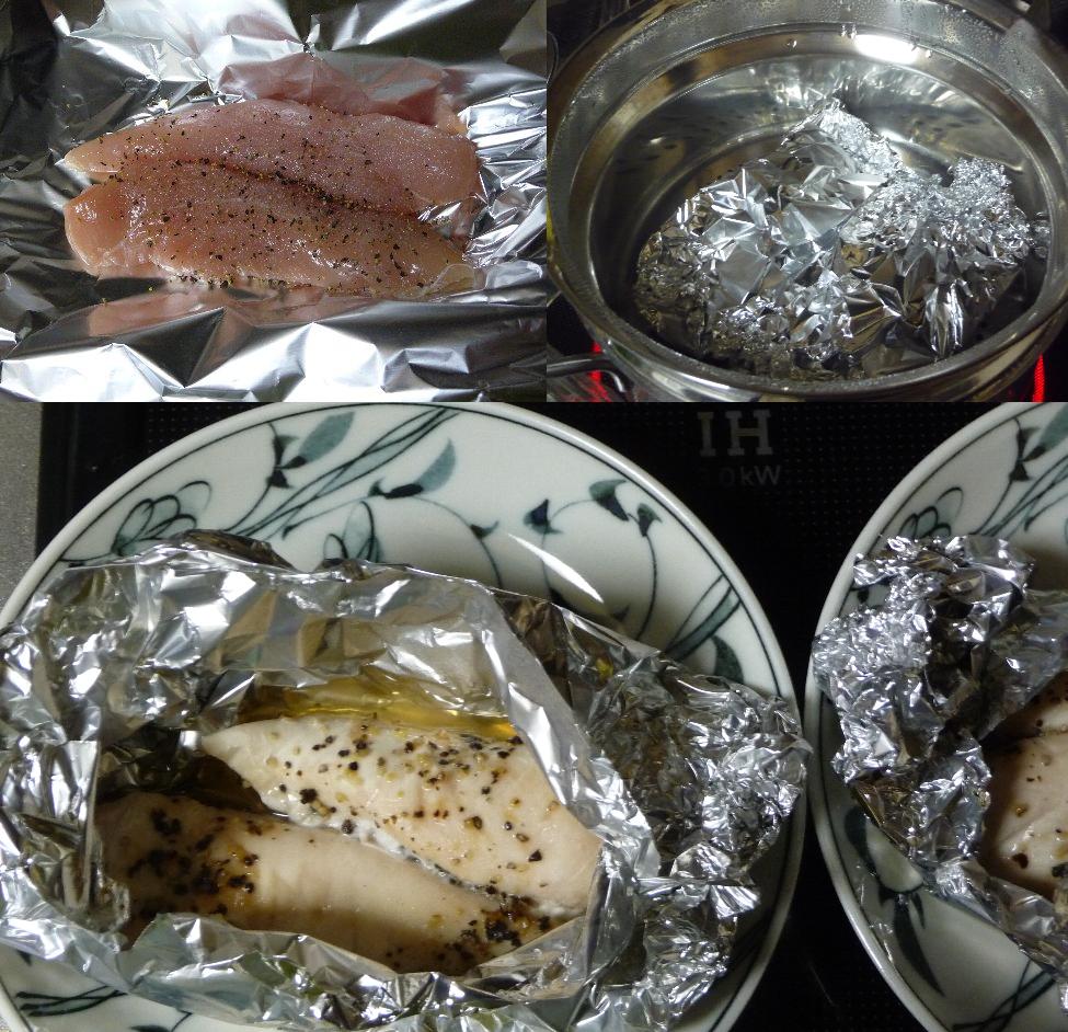 ささみに塩・胡椒してお酒を振って蒸すだけなの。