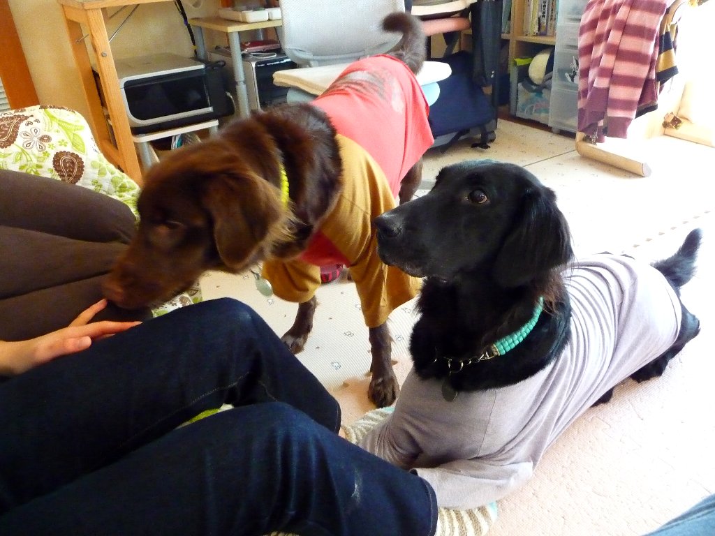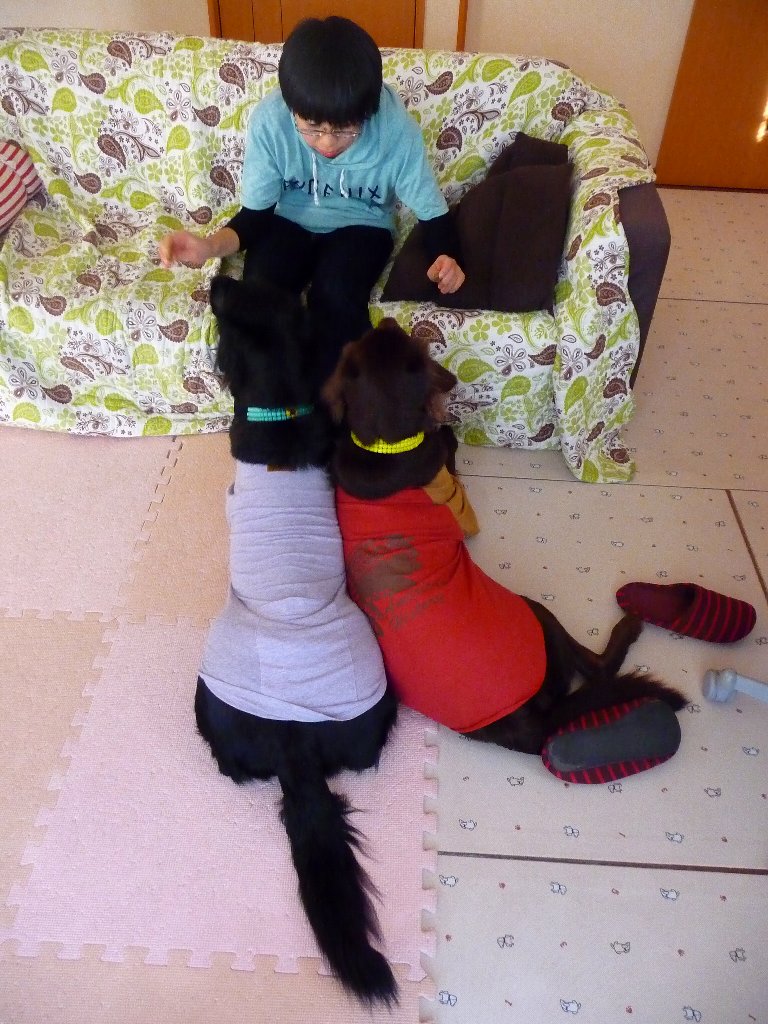 一番遊んでくれる姉ちゃんを見つめる2ワン、