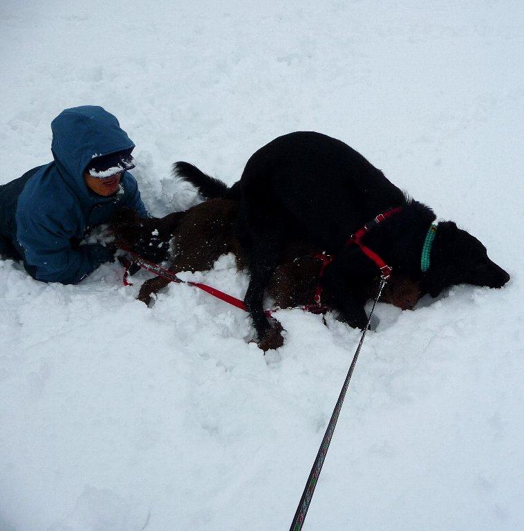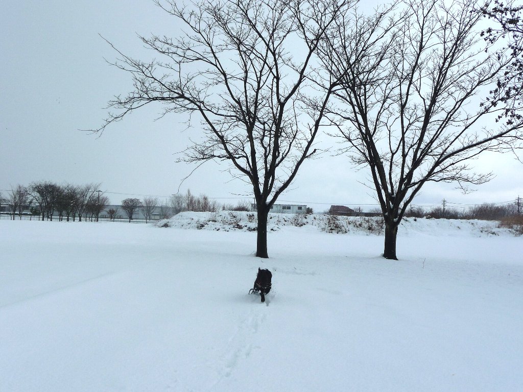 後ろを歩いてた凜パパと凜、chababaが前をずんずん歩いていくもんだから凜が引張り気味だったところに野っぱらではグンと積雪量が増え歩きにくかったんでしょうね(^^;)凜パパリードを放しちゃった・・・多分カヤを引いてたらカヤが横すり抜けてったんだろうなぁ~。
