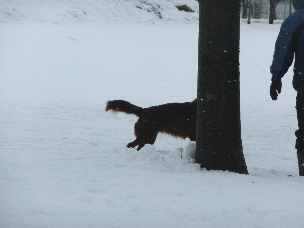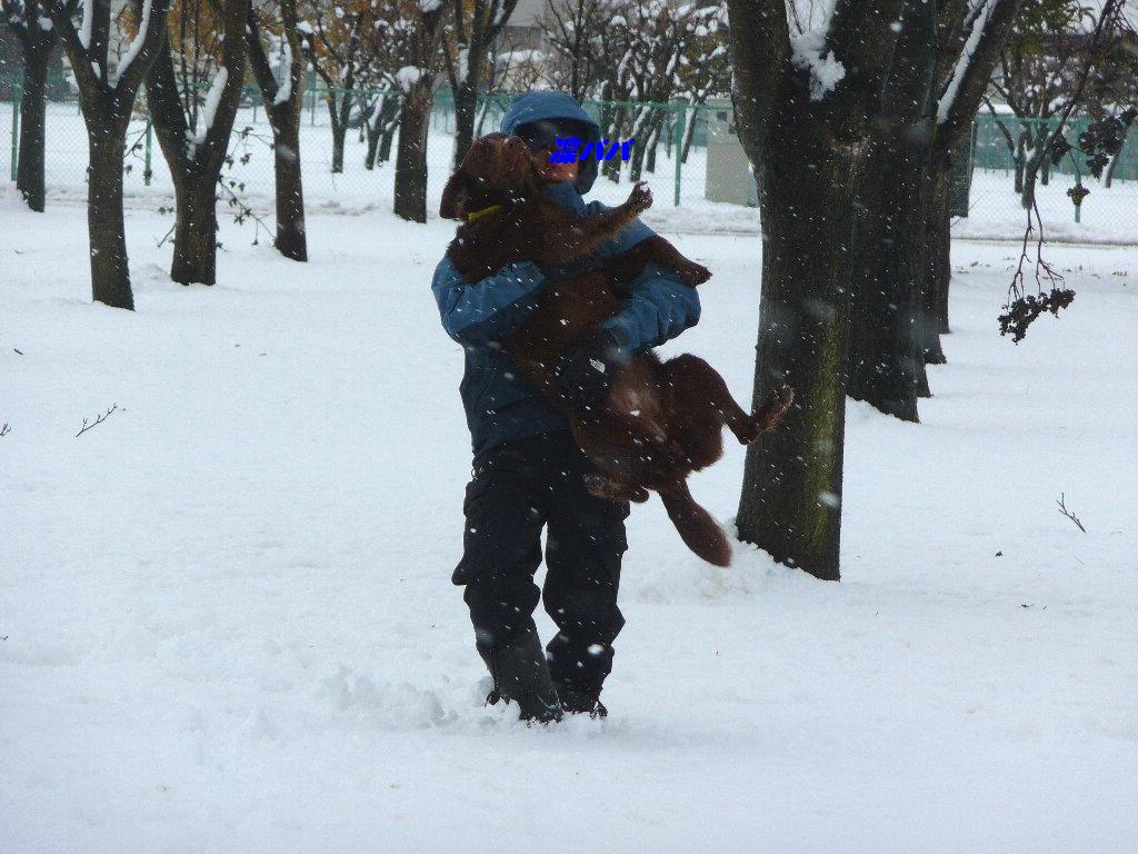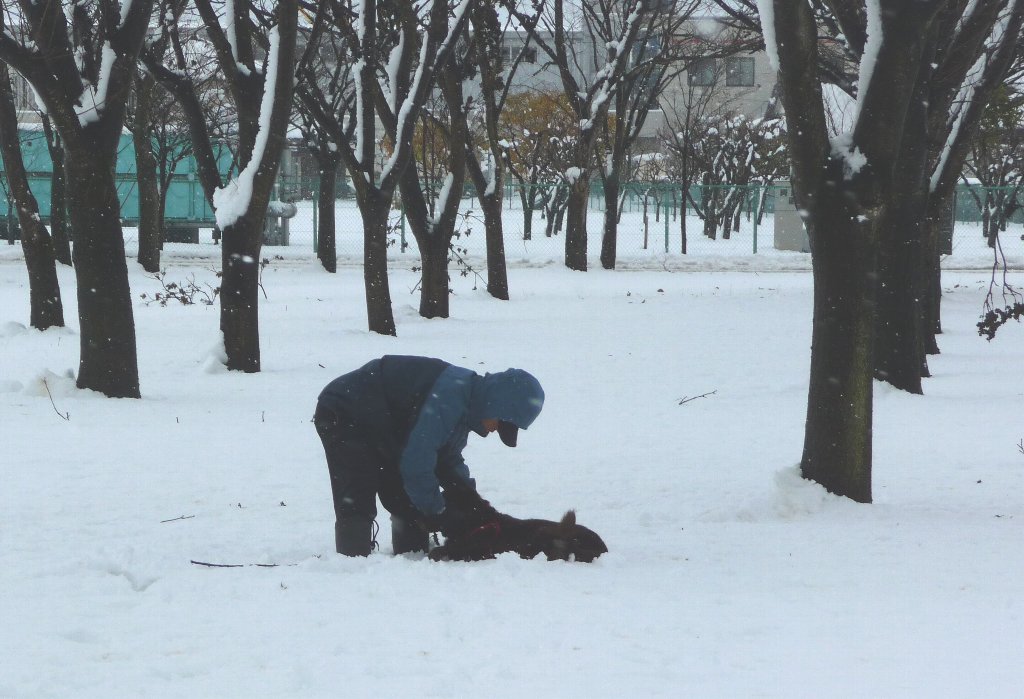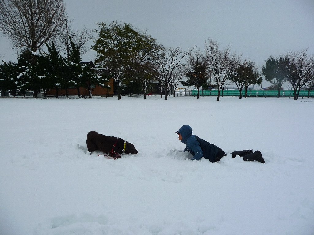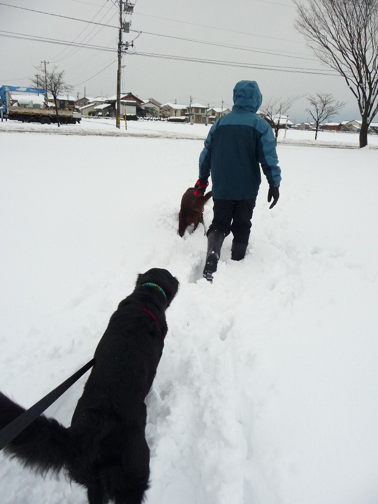 夜散、既に公園の雪は姉ちゃんの膝くらい?カヤの足は全部隠れちゃうくらいです、その後も懇々と降り続いてます(--;)