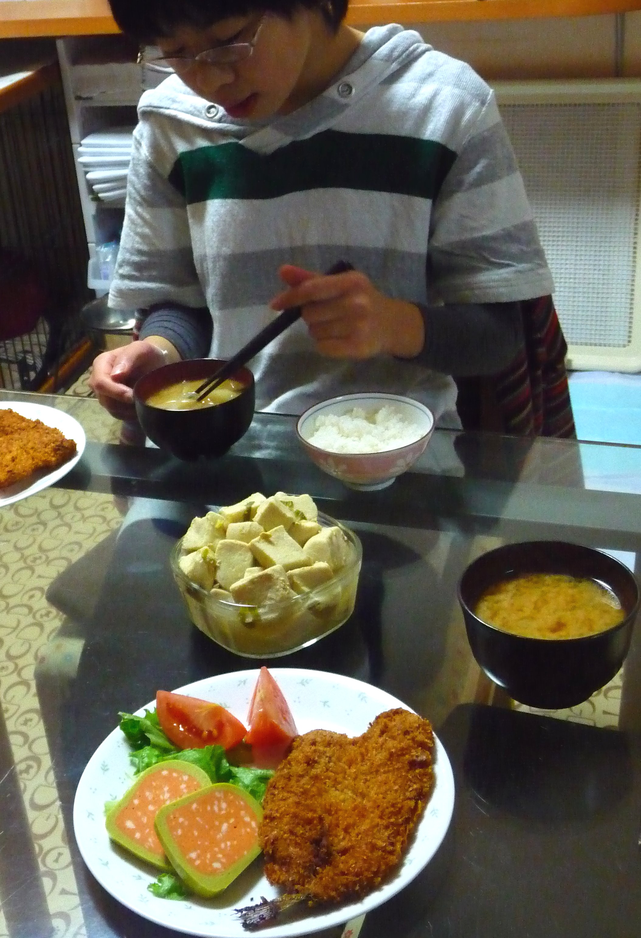 んで、今日はクリスマス本番、なんだけど凜パパ普通にお仕事で昨日我が家はクリスマスでぃな~してるし、昨日パイやらローストビーフやら、残っちゃってもどうにもなんないしと頑張って食べた海鮮太巻きやらでおなかが重たくってこりゃいけないと今日はきっちり味噌汁作って(味噌汁飲まないとなんだか調子がいまひとつなんだよねぇ~)カマスのフライに買ってきたアボガドサーモンのテリーヌを置いてちょっとクリスマスっぽさを出して、でもでもそれよりもバクバク食べたのは高野豆腐!喉の通りもおなかにも優しい夕飯となりました。