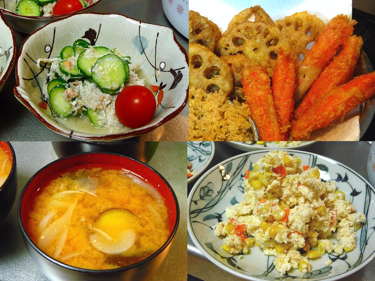 そして蟹の身を一生懸命ホリホリしたのときゅうりで酢の物、レンコンとカリブの天ぷら、コーンの芯と昆布で出汁をとったサツマイモと玉ねぎとワカメのお味噌汁、コーンと人参入りおからサラダ!