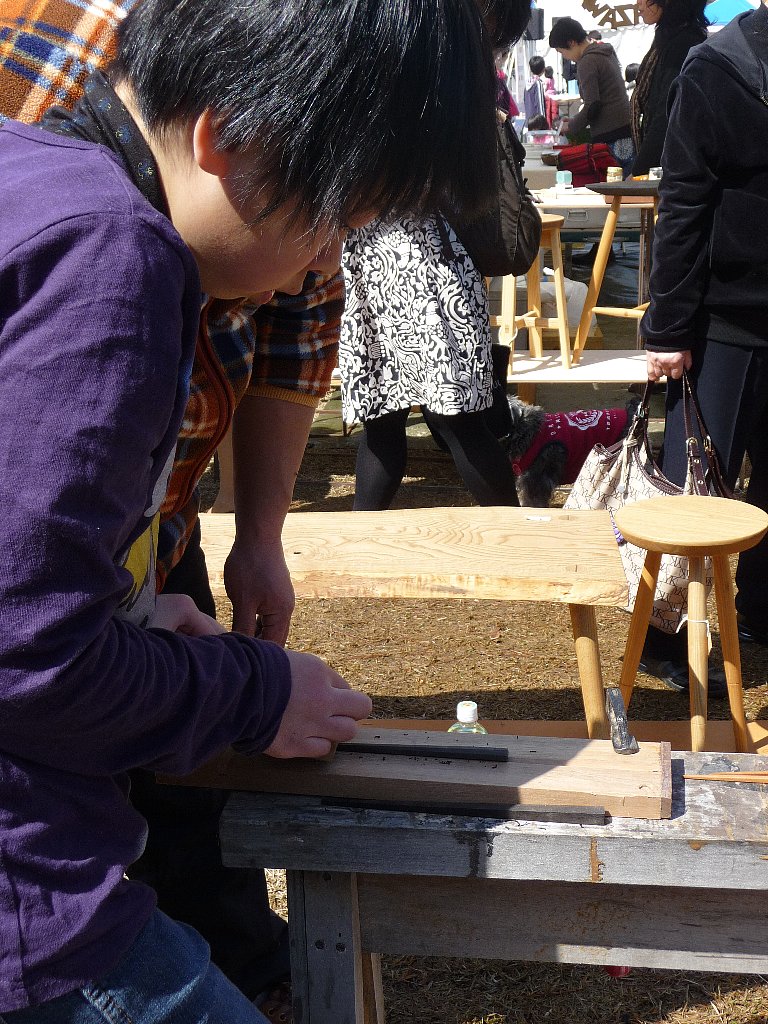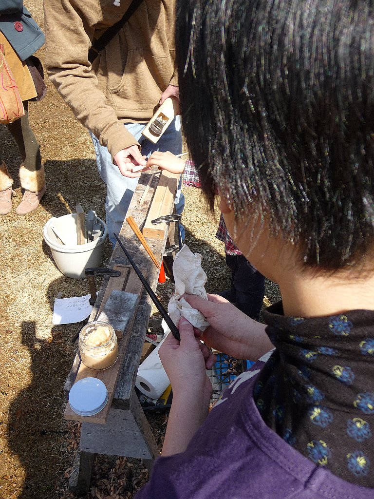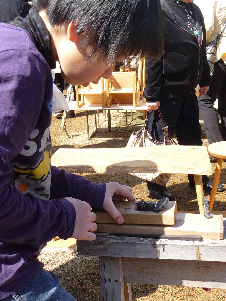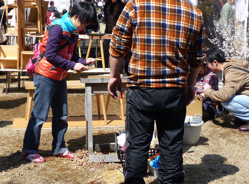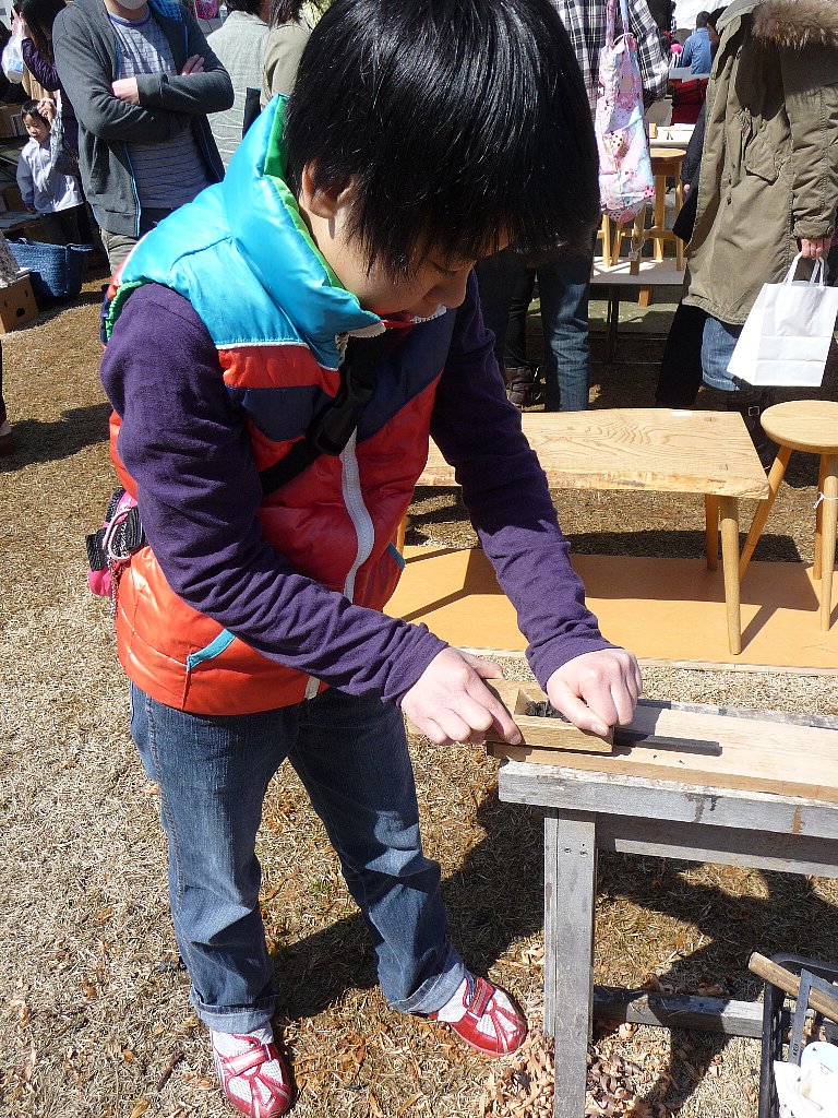 姉ちゃんがやってたら小さな男の子もやってきて、一度にできるのは2人まで、やっぱ実際作ってるの見ると作りたくなるようで私も私もと人が寄ってきて順番待ち、木工作家さん休憩したかったみたいけど(^^;)