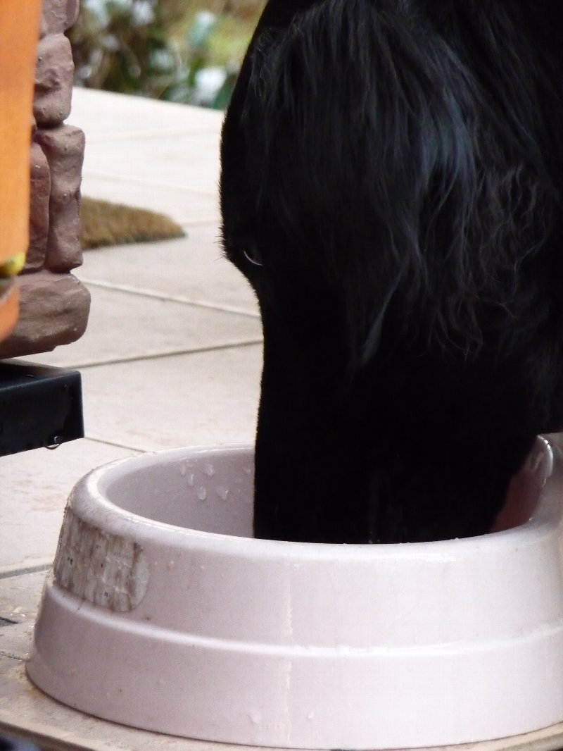 11時過ぎに終わって、合間合間にフードをやったりちょっとおろしてやったり、それでもずいぶん長いこと車の中でいい子にしてくれてた凜さん、とりあえずは水分補給です。