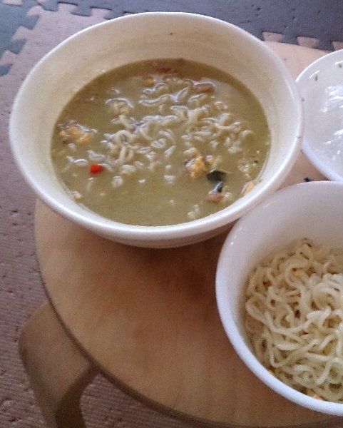 サッ〇ロ一番塩ラーメンにイ△バのグリーンカレー(ツナ)を入れたらんまぁ~い(^(00)^)