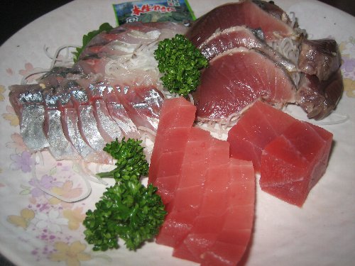 マグロだけってのもなんだったんで(ってか見てたらどいつも旨そうで・・・)かつおのたたきとアジのお刺身もお買い上げ。