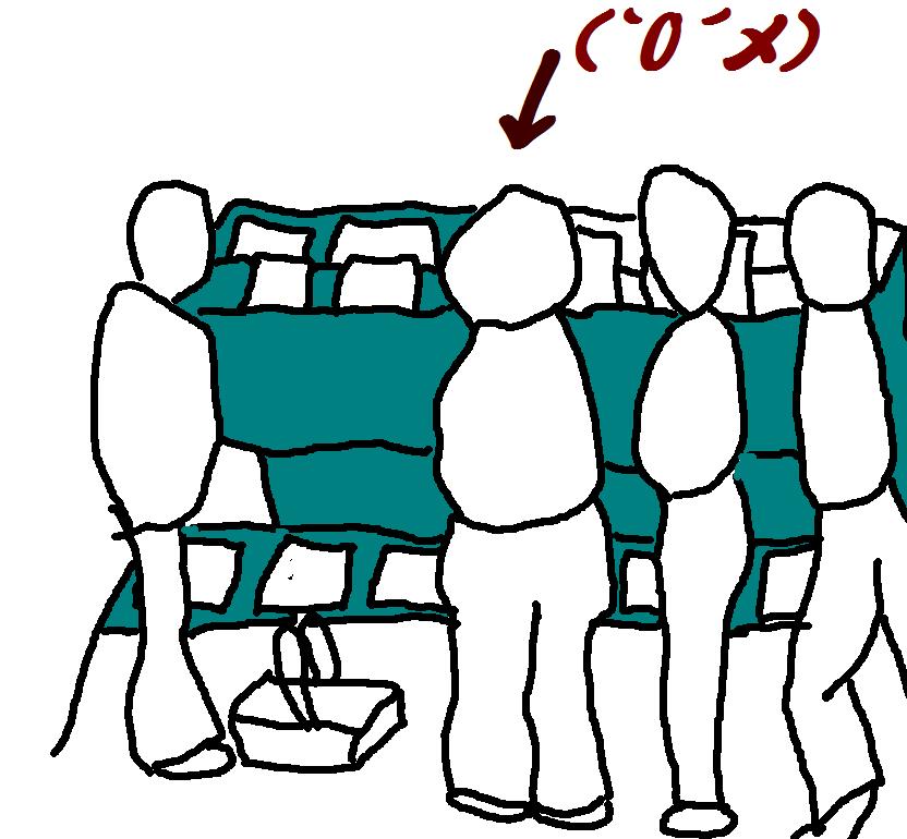 って言うか一人の人の横には買い物籠が置いてあって、それで完全に本棚の幅全部塞いでる感じ。