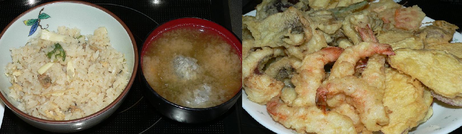炊き込みご飯とみぎすと豆腐と葱のお味噌汁それに天ぷらぁ~。