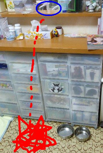 カヤがご飯を食べてるときに、青丸部分においてあったコーヒーサーバーが落下・・・そして大破(--;)