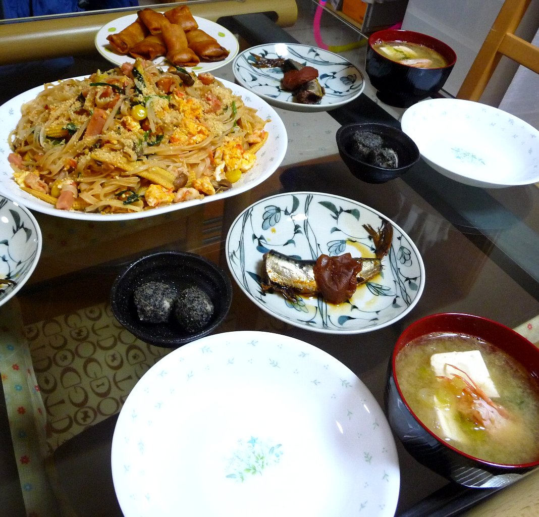 タイ風やきそばバッタイ、エビの頭と豆腐と葱の味噌汁生姜入り、買ってきた里芋の胡麻和えと春巻きと一緒に
