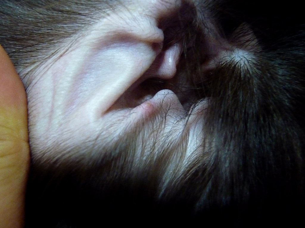 わかりにくいけど目じりと耳の中に小さな小さなポッチ。