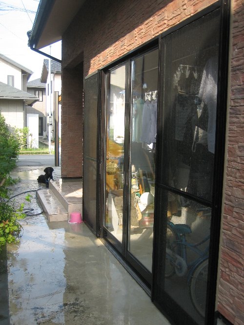 とりあえず、サービスヤードの窓と網戸が梅雨の間に砂埃でありえないくらい汚くなってるし、こんなんじゃ風も通らないんじゃない?通ったとしても砂が舞い込む???(いや実際舞いこんでたし)って感じだから庭の水撒きついでに洗っちゃえぇ~!!
