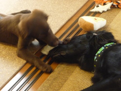 電池切れかと思われたカヤも凜が動けば動き出し、それぞれいただいたおもちゃで遊んでたんだけど・・・
