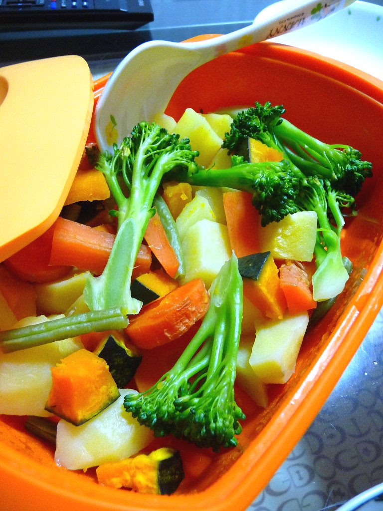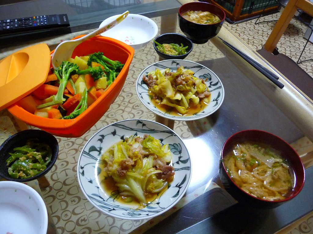 今日の夕飯、温野菜サラダにピーマンのピーナッツ和え、それからキャベツと豚肉の生姜炒め(^(00)^)