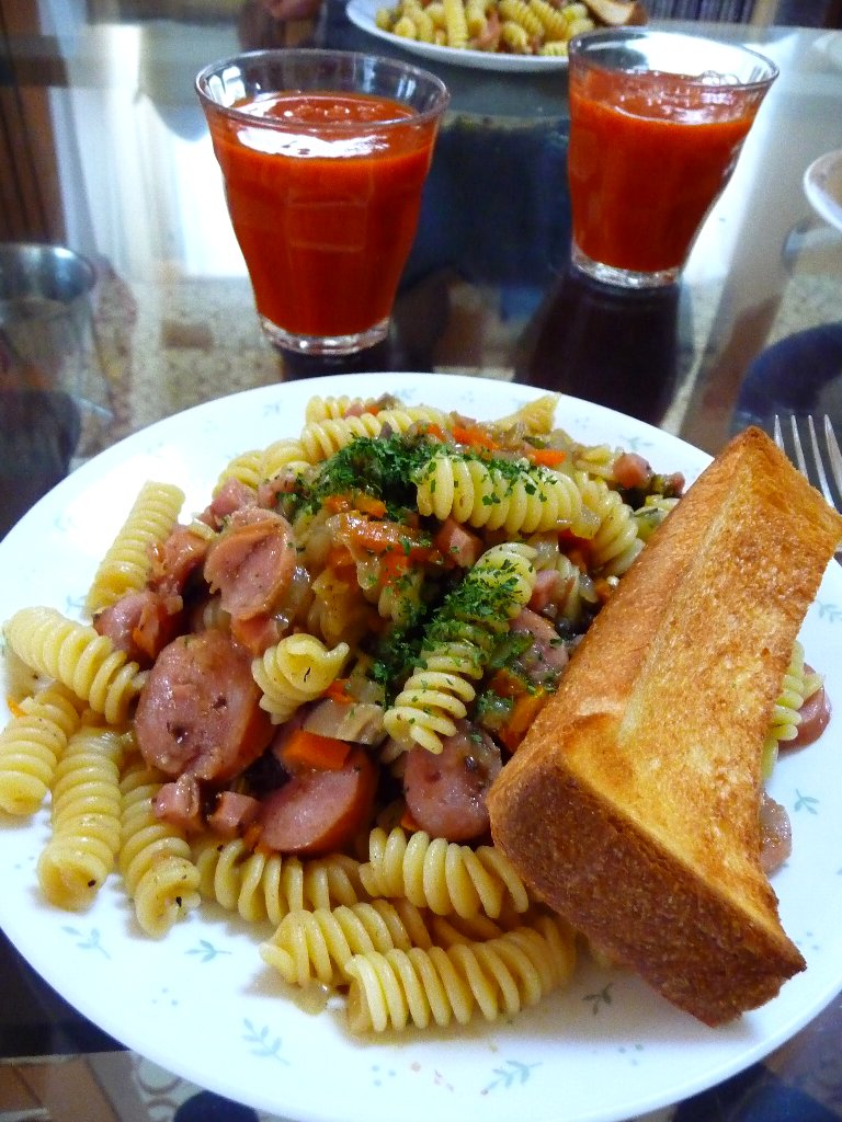 ズッキーニに玉葱にナスに人参にセロリ、あと椎茸にフランクフルト!野菜いっぱいのパスタよん♪