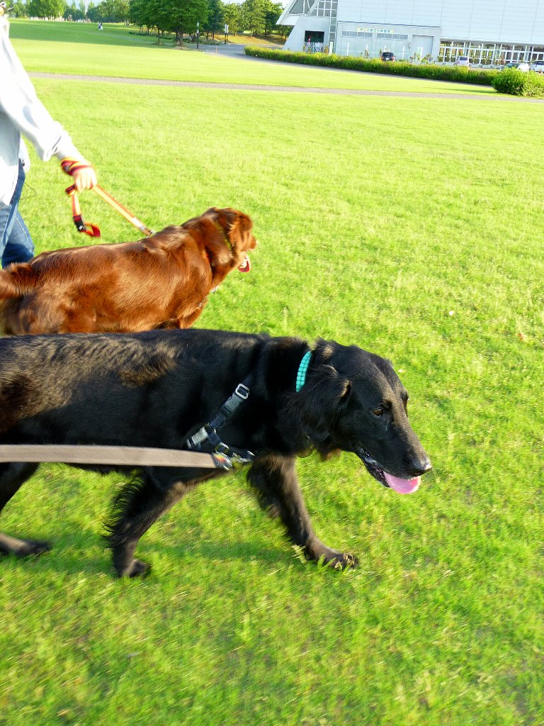 それぞれ離れてたんだけどそのうちの1匹がもう1匹の方にもうダッシュ、飼い主さんの制御効かず、まぁもめることは無くその子のところへ行ってみたかっただけのようだったんだけど、たまたま何も無かったってことだよね。