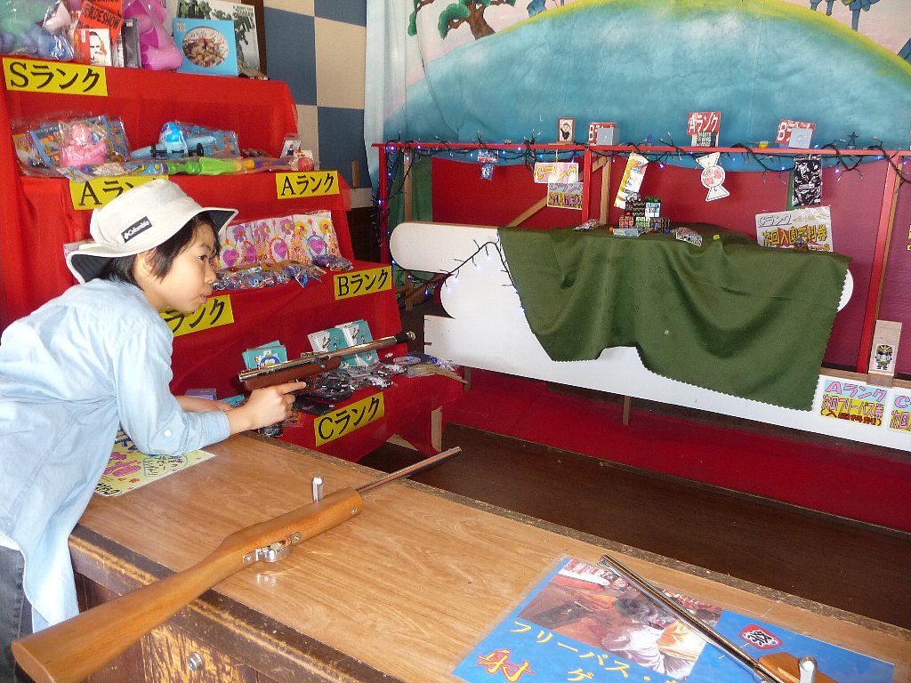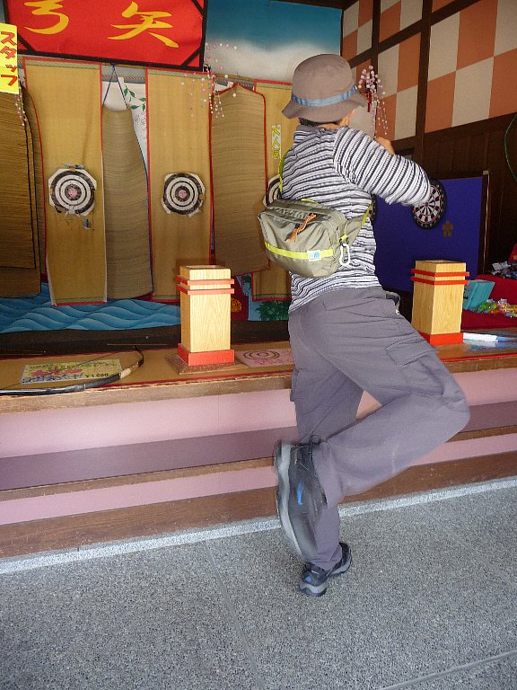あたりやさんでフリーパスで射的か吹き矢か弓矢が1回できます、ねえちゃんは射的、凜パパとchababaは弓矢にしました。