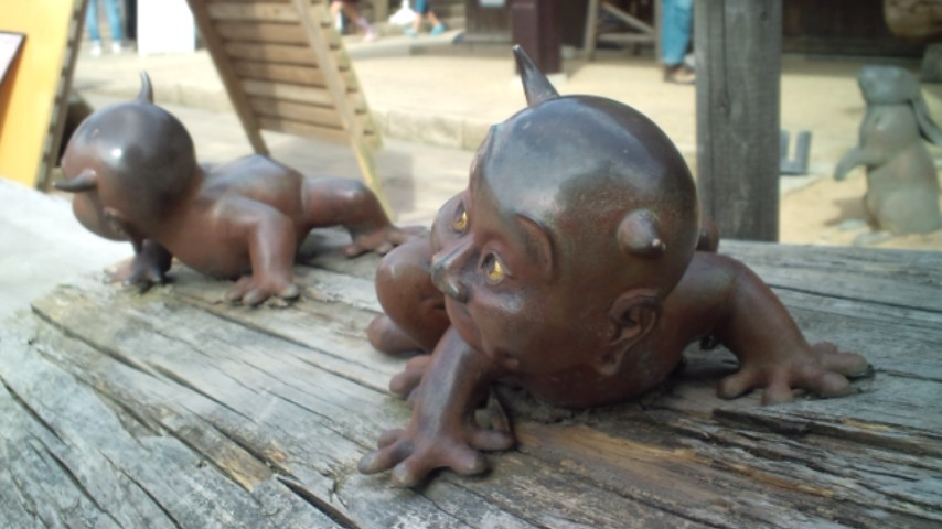 で、河童お化け屋敷に入ったんだけど(凜パパ謹んでご遠慮されてました^^;)本当はキタローの格好した人が案内してくれるらしいのだけど???誰もいません、まぁフリーパスの人はそのまま入ればいいんだけど・・・と入り口にあった懐中電灯(といえるほどの代物ではなく)しばし進むも・・・すごく暗くって、で、・・・何もでてこなくってものすごく怖い?真っ暗で右にも左にもいけるとこが出てきてドッチに進んでもなにかが後から来たらと思うと怖くて入り口に戻っちゃいました(^^;)