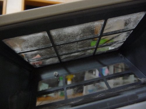 ってゆうのはね、このシリーズのこの機種、風量がかなりのもんらしくこの切れ目からどんどんどんどん行っちゃ行けないとこに風がこまかぁい埃を送り込んで・・・ヒートポンプの片面がまっしろびっしりこそげ落とさなきゃいけないくらいに埃が(--;)