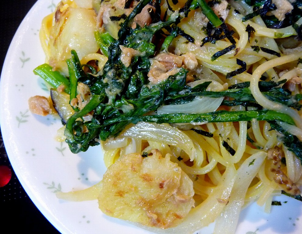 里芋と玉ねぎ・ナスに春菊、それからシーチキンのウニクリームパスタ
