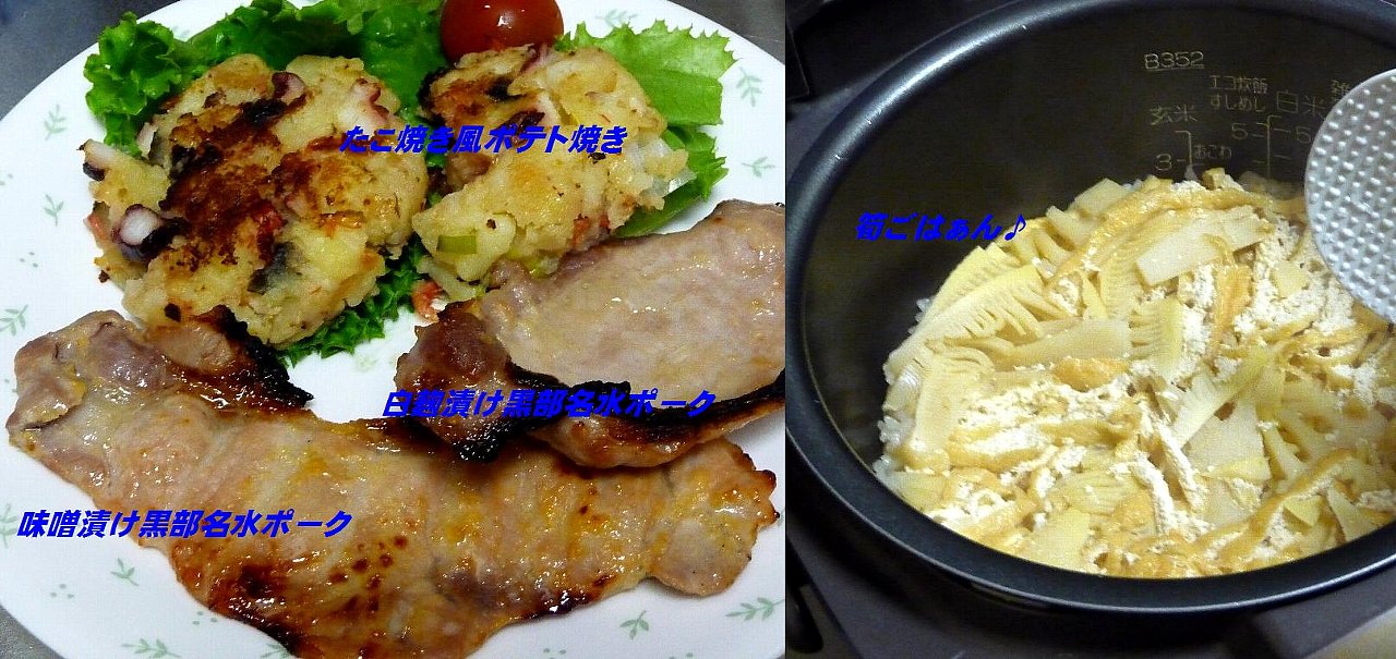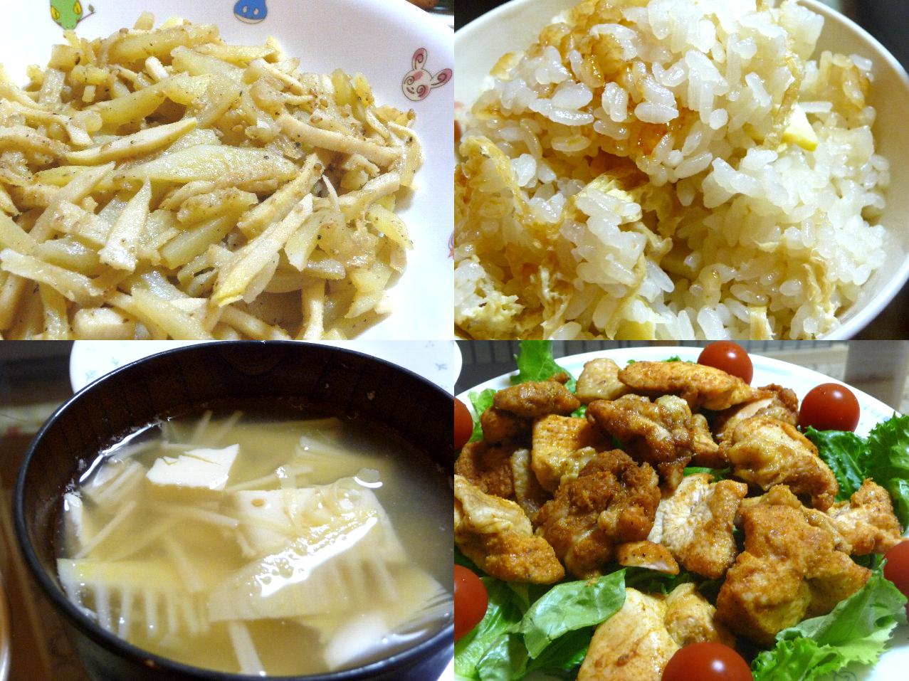 夜には筍ご飯と筍とジャガイモの炒め物と筍のお味噌汁、そしてまぶすだけタンドリーチキン(^(00)^)