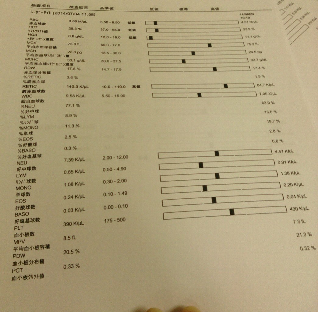 子供の赤血球は前回の血液検査時以上に作ってはいるのですがおっついていないようです。今更ながら5日前の消炎剤を打ちに行った時に予定を繰り上げて血液検査をしてもらって今日の処置を少しでも早くしなかった事が悔やまれてなりません。