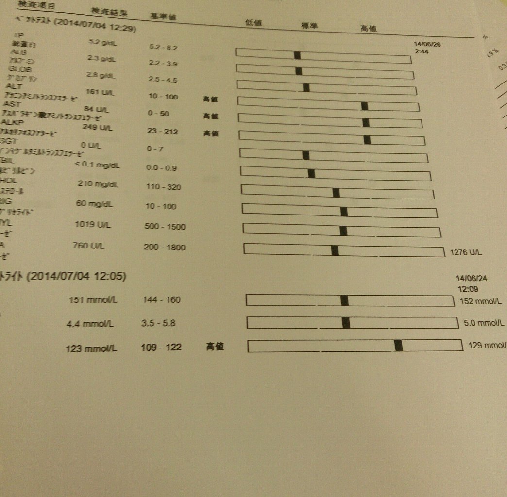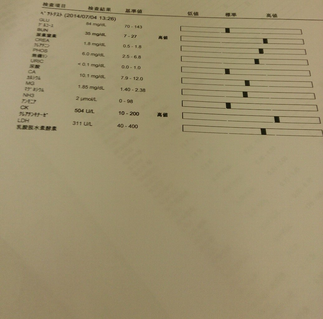 今日血液検査をしたら腎臓とか肝臓の数値は若干高値なものの心配するほどのものでは無いけれど赤血球が更に減っていました。
