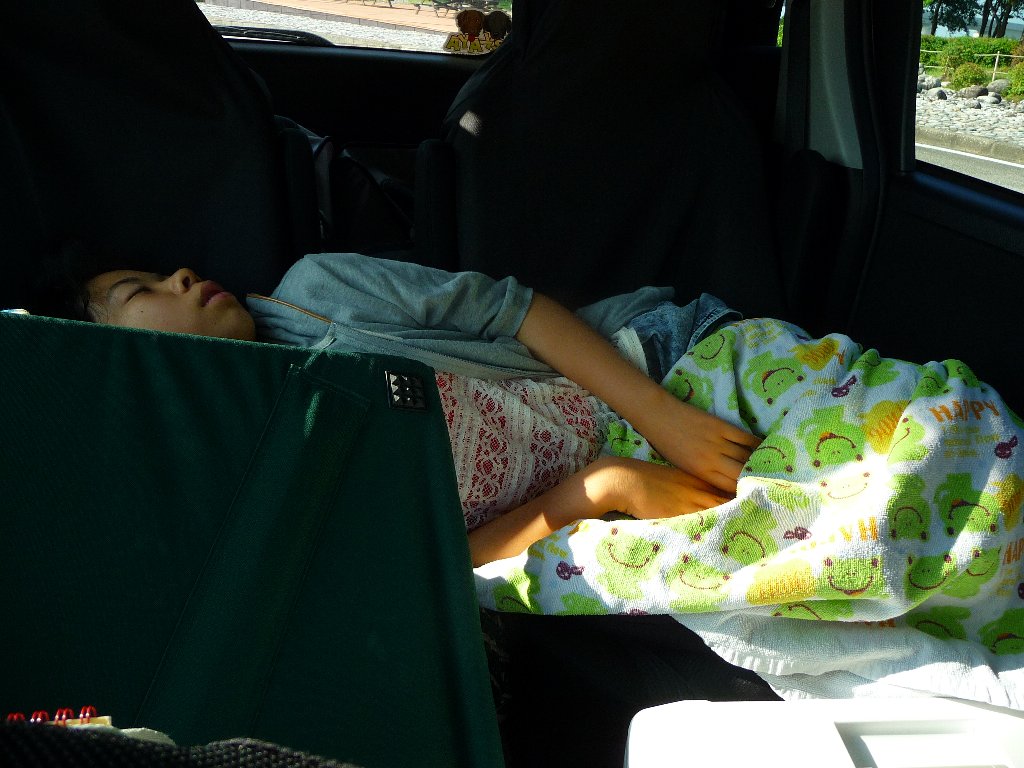 で、さっきまでずぅっと寝てた姉ちゃん、エンジン切って窓開けたんだけど暑かったようで起きてきて、お腹すいたぁ~って(^^;)少し乾かさんと乗れんだろうが。