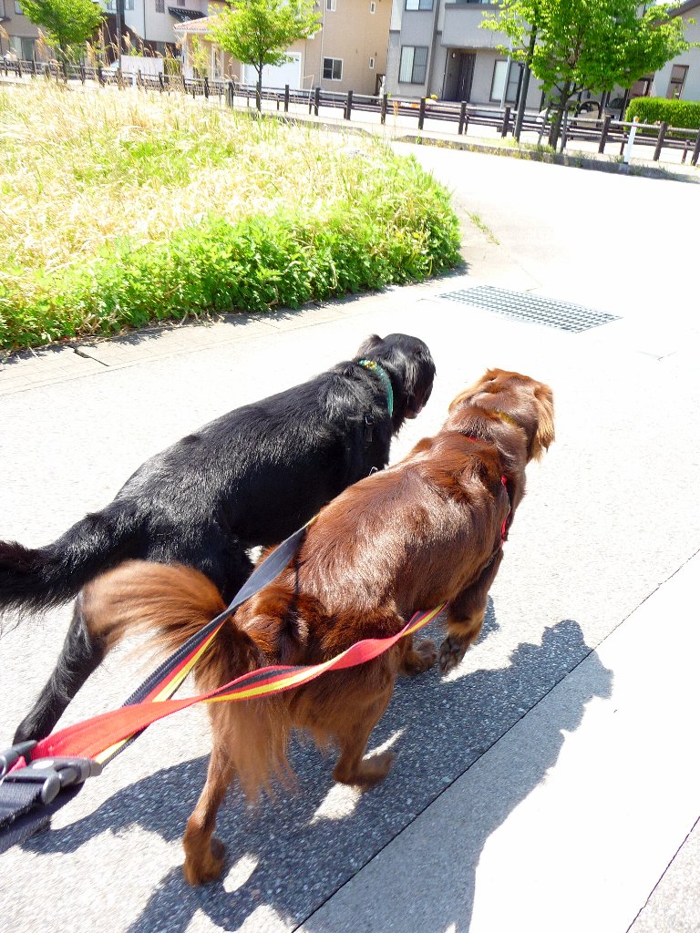 さて今朝の朝散、シンクロしてます?二人で引っ張るでない!(--メ)