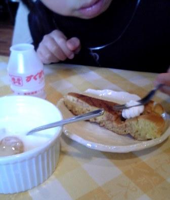 ホットケーキのパンケーキみたいなのの中にジャムが混ぜてあってホイップクリームののった物と、果物を入れたとろとろの無糖のヨーグルト。