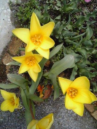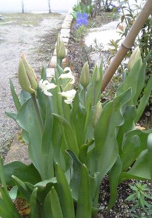 で、とりあえず燃えるゴミを出してこようと外にでたら・・・この間から開いたり閉じたりして楽しませてくれてたチュウーリップも水仙も、ちょっと残ってたヒヤシンスも首が曲がっちゃってお顔が地面についてます。