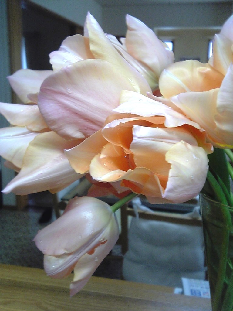 片づけをして、今朝切花にしたチューリップがあんまりきれいでケータイを駆使して写真撮ってると・・・撮って欲しがるやからが・・・。