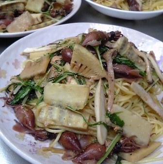 蛍烏賊と竹の子と水菜とエリンギ、それに明太子を入れてちょっぴりしょうゆ味のパスタです。