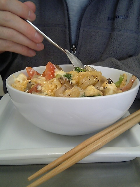ベーコンとパプリカやマメなんか野菜がいっぱい入ったパスタらしいです。
