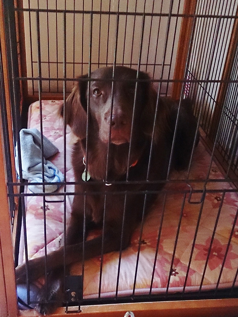 エアコン交換は12月の6日、この日は工事のお兄さんが出入りしてカヤさん作業ちぅはケージの中。