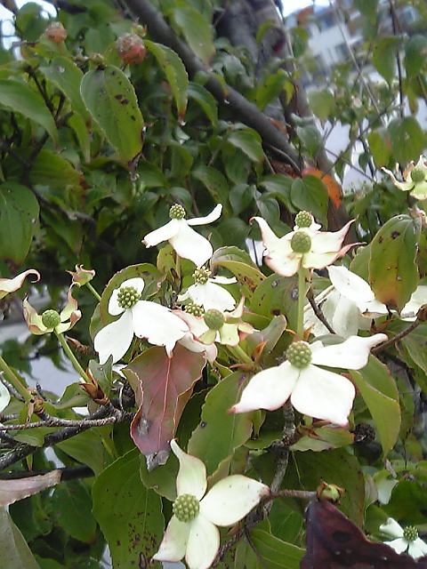 で、この清清しさで間違えちゃったのか、ココのところの異常気象のせいなのか我が団地の街路樹の1本の山法師、こんなことになっちゃってます。