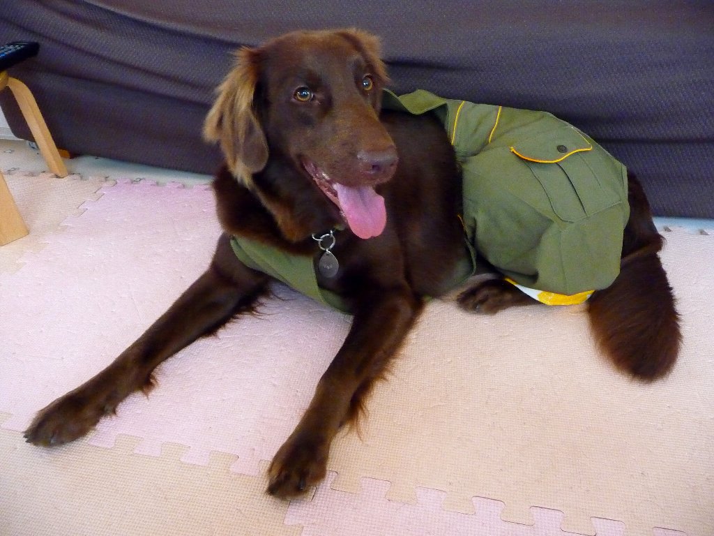 肩からしっかり着せて後ろ足に少し長さもあるので中のパットも引っ張り出せ無い?(とはいえ凜さん器用に鼻突っ込んでパット引っ張り出してびりびりにするかもだけど・・・)と思って買ってみましたペコレ おむつカバー。