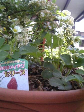 あっ!去年収穫してそのままほっといたイチゴにまた花が、美味しいのつくかなぁ?